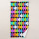 This towel set has a pink washcloth, a purple hand towel, and a bath towel with a geometric design of neon diamonds overlapping each other on a field of black.