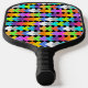 This pickleball paddle has a geometric design of neon diamonds overlapping each other on a field of black.