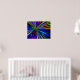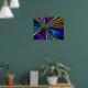 Bright digital artwork created from a fractal image recreated into an explosion of rainbow of colours that are reminiscent of neon lights against a black background.
