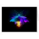 Antique, mechanical firefly with light bulb and thin wings glows orange, purple, turquoise on black background. Steampunk style.