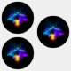 Antique, mechanical firefly with light bulb and thin wings glows orange, purple, turquoise on black background. Steampunk style.