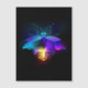 Antique, mechanical firefly with light bulb and thin wings glows orange, purple, turquoise on black background. Steampunk style.