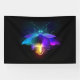 Antique, mechanical firefly with light bulb and thin wings glows orange, purple, turquoise on black background. Steampunk style.