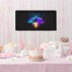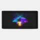 Antique, mechanical firefly with light bulb and thin wings glows orange, purple, turquoise on black background. Steampunk style.