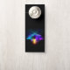 Antique, mechanical firefly with light bulb and thin wings glows orange, purple, turquoise on black background. Steampunk style.