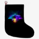 Antique, mechanical firefly with light bulb and thin wings glows orange, purple, turquoise on black background. Steampunk style.