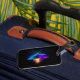 Antique, mechanical firefly with light bulb and thin wings glows orange, purple, turquoise on black background. Steampunk style.