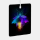Antique, mechanical firefly with light bulb and thin wings glows orange, purple, turquoise on black background. Steampunk style.