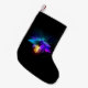 Antique, mechanical firefly with light bulb and thin wings glows orange, purple, turquoise on black background. Steampunk style.