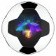 Antique, mechanical firefly with light bulb and thin wings glows orange, purple, turquoise on black background. Steampunk style.