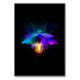Antique, mechanical firefly with light bulb and thin wings glows orange, purple, turquoise on black background. Steampunk style.