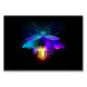 Antique, mechanical firefly with light bulb and thin wings glows orange, purple, turquoise on black background. Steampunk style.