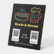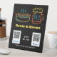 Modern and stylish QR code payment option tabletop pedestal sign for your event booth, mobile food truck or concession stand, featuring a neon hot dog and beer mug on black background. Add your custom qr code and company details.