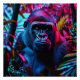 A digital rendering of a large male gorilla in a rainforest with stylised neon lighting.