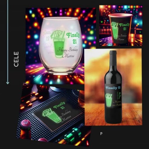 A drink at your 21st birthday party; Neon green umbrella drink with green text that says Finally 21 and birthday text with your name.