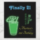 A bottle of wine at your 21st birthday party. Neon green umbrella drink with green text that says Finally 21 and yellow birthday text with your name. A neon green woman dances in celebration.