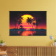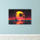Silhouetted palm trees frame a massive glowing sun striped in retro orange and pink against a starry night sky. A luminous cyan grid stretches across the foreground, its perfect reflections shimmering on the water-like surface below. This iconic synthwave scene pulses with 80s nostalgia and futuristic tropical vibes, ideal for posters, canvas prints, phone cases, mousepads, throw pillows, and décor that brings bold vaporwave energy to any space.