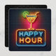 Bright neon lights display the message "Happy Hour" and cocktail graphic on a brick wall background,