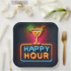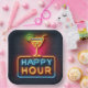 Bright neon lights display the message "Happy Hour" and cocktail graphic on a brick wall background
