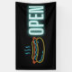 Neon blue "Open" text with neon hot dog silhouette on black background makes this a great design for personal and a variety of restaurants and eateries