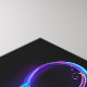 Glowing, purple infinity symbol with flying, luminous, blue hummingbird on black background. Neon.