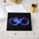 Glowing, purple infinity symbol with flying, luminous, blue hummingbird on black background. Neon.