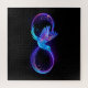 Glowing, purple infinity symbol with flying, luminous, blue hummingbird on black background. Neon.