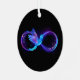 Glowing, purple infinity symbol with flying, luminous, blue hummingbird on black background. Neon.
