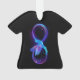 Glowing, purple infinity symbol with flying, luminous, blue hummingbird on black background. Neon.