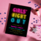 Fun bachelorette party invitation with Girls' Night Out written with neon lights in magenta, yellow, and turquoise against a black background.