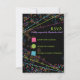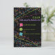 Neon lights and laser beams decorates this fun response card that coordinates with our glow in the dark / black light themed party invitation. With text of bright lime green and neon purple, and colourful confetti shapes, each line can be customised for your event.