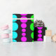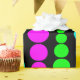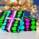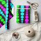 This wrapping paper has a mid-century modern design of neon pink, green, and blue rounded rectangles in increasing and decreasing size running vertically on a field of black.