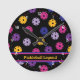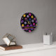 Neon pink, yellow and purple on black pickleball pattern, custom text Round Clock. Perfect as a gift for pickleball player. Customisable text on both sides