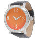Bold , neon orange coloured watch face design - Arabic numerals in white . Wrist watch for him who likes bright colours . You can customise it now with his name / text / monogram etc . Unique design by Alma Wad .