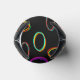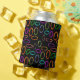 This can cooler has a geometric design of groups of three ovals in neon colours scattered about on a field of black.