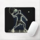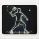 A neon figure of a pickleball player in mid-action poised to hit a pickleball ball with a paddle on black