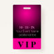 This custom VIP badge features a black background with a glowing neon pink gradient in the centre. The title "VIP" is printed in large black text over a neon pink background. The date and name of the event is printed above in plain white text. The back of the badge features a white background with a neon pink text area where you can add your own custom text or addition event information. It's perfect for parties, fundraisers, a concert, or other special event.