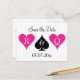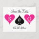Neon pink and black Las Vegas wedding save the date postcards. King and queen of hearts monogram design with initials of bride and groom plus date of marriage. Poker playing card suits, hearts and spade. Elegant script typography text. Personalise info.