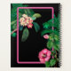 A modern yet retro themed neon pink tropical botanicals on a black background. A beautiful design ideal for summer. Perfect neon pink tropical plants design featuring palm trees, pink Hibiscus flowers and Plumerias Frangipanis flowers. Black, pink, and green colours dominate this tropical pink neon design.