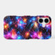 Vibrant neon abstract polygon shapes bursting with explosive sparks on a striking black background.
