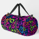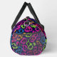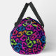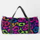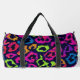 This image showcases a duffel bag featuring a dynamic and playful leopard print pattern. The spots are rendered in vivid neon colours, including bright pink, electric blue, lime green, and vibrant orange, set against a dark, possibly navy or black, background. The texture of the spots appears somewhat textured or distressed, adding to its edgy appeal. Black straps are visible, completing the practical design. This bag makes a bold fashion statement, perfect for adding a pop of colour to any outfit or gym routine.