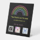 Stay connected with customers or groups using this tabletop pedestal sign that features a neon rainbow graphic with customisable text and social media qr codes on black background