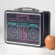 Custom lunch box with a neon retro cassette player and radio design in pink and green tone blue colours. Personalise it with a name or any custom text. Ideal as a lunchbox, timeless keepsake, utility box, or display decor. Double-sided with the same design.