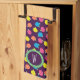 Stylised roses in bright neon pink, blue, yellow, and coral with neon green leaves are spangled across a deep purple background to create a fun floral pattern. Customise the monogram on this towel with your initials to make it uniquely your own.