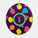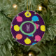 Stylised roses in bright neon pink, blue, yellow, and coral with neon green leaves are spangled across a deep purple background to create a fun floral pattern. Customise the monogram on this ornament with your initial to make it uniquely your own.