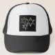 This cap has a design of three Jewish stars in neon colours on a black background.