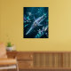 A sleek neon swordfish races through futuristic ocean depths, built from chrome scales, glowing propulsion lines, illuminated fins, and a razor-sharp energy blade. Electric blue, cyan, violet, and silver light streaks across its streamlined body, capturing pure speed and elegance. Tunnels of light, glowing reefs, bubbles, motion trails, suspended particles, and deep dark water enhance the cinematic rush. This premium marine design is perfect for offices, gaming rooms, coastal interiors, and collectors who love dynamic ocean creatures.