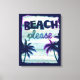 Tropical vacation beach wood featuring palm trees with beach please in sunset neon pinks and aqua in a tiki and nautical rope font.