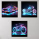 A stunning set of neon wireframe vehicle designs, featuring a car, motorcycle, and bicycle. This futuristic collection is perfect for lovers of innovative and sleek tech-inspired art.