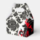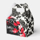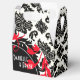 A bold, stylish favour box featuring a glamourous damask pattern of black, white and red. Use the "Customise It" button to personalise with your own text. If you need help, please contact me BEFORE you place your order. Email: cheryl@glamprettyweddings.com/contact. Matching invitations, save the dates, paper cocktail napkins. other favour box shapes and many other products available. "Neopolitan Damask Paisley" original design by Cheryl Daniels © 2014.